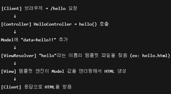 Template Engine(예: Thymeleaf)이 실행돼서 ${data} 자리에 "hello!!" 넣은 HTML 생성한다.