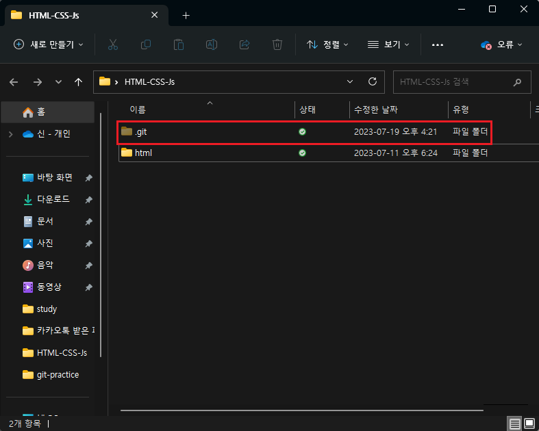 그러면 선택한 폴더에 .git 이라는 파일이 생성되는 것을 확인할 수 있습니다.