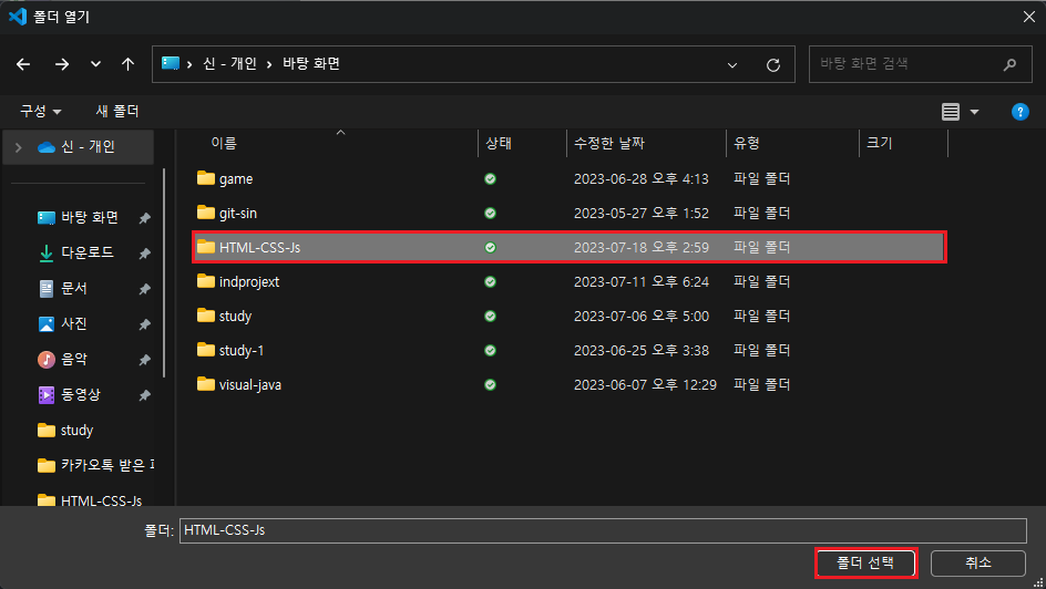 기존에 만들었던 파일을 선택하고 폴더 선택하기를 클릭합니다.