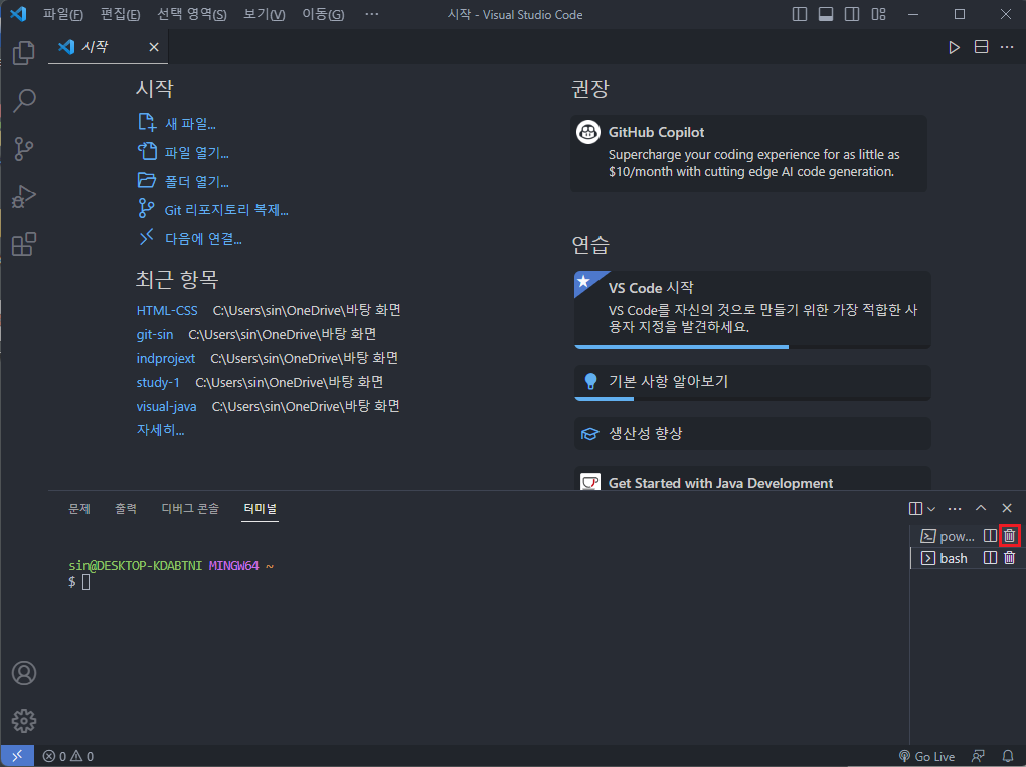 그리고 다시 Ctrl + Shift + ` 로 터미널 열어주고 기존에 있던 powershell은 삭제