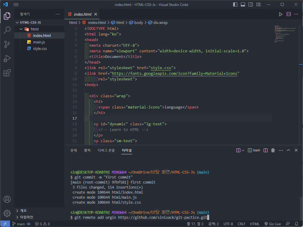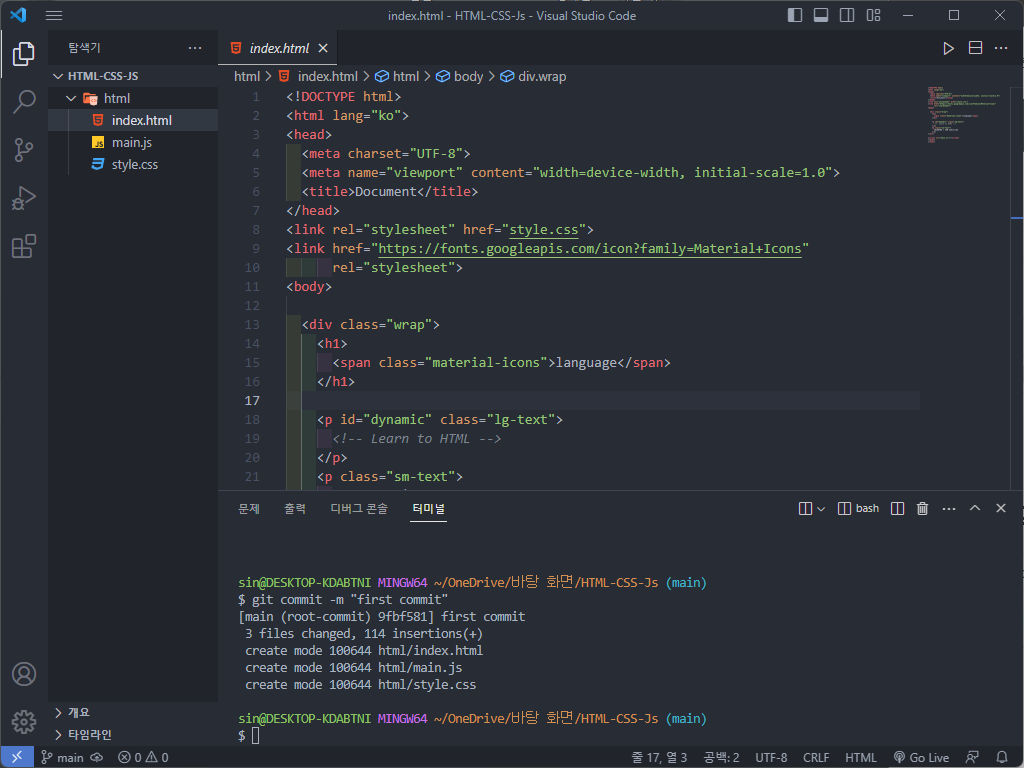 git commit -m "first commit"를 입력합니다. ex) 커밋이름은 상관없음