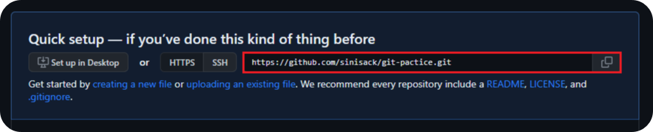 git remote add origin {위에서 복사한 저장소 주소} | 로컬저장소(Git)와 원격저장소(remote) 연동 |