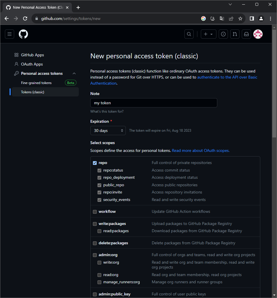 personal access tokens ▶ Tokens(classic) ▶ Generate new token ▶ Generate new token(classic)