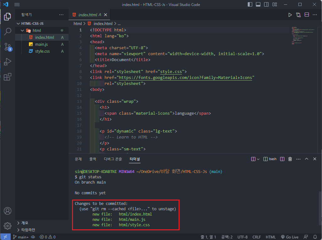 git add . | 모든 파일 관리, 만약 특정파일만 하고 싶다면 git add 파일이름.파일형식 ▶git add index.html |
