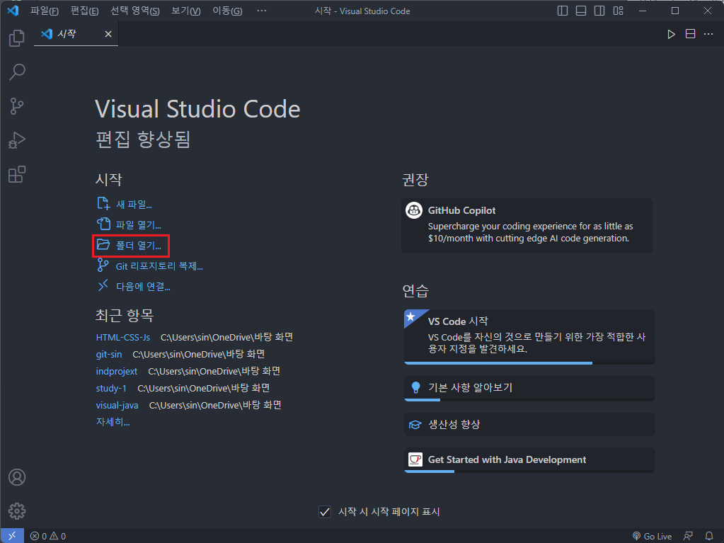visualstudio에 들어가 폴더 열기를 클릭합니다.