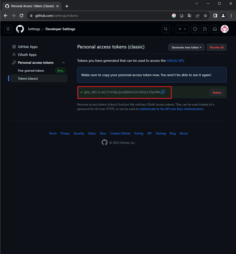 현제 페이지를 나가면 다시는 토큰을 볼 수 없기 때문에 따로 복사해 줍니다.